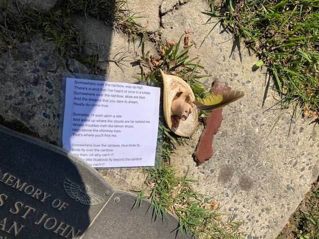Feather returns to the grave of her father. She plays an Irish tune on her whistle and then sings Somewhere over the rainbow, skies are blue…..